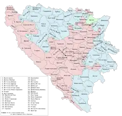 Map of the municipalities of Bosnia and Herzegovina, showing the FBiH in red, the RS in blue, and Brčko District in green. (Names are in Macedonian).