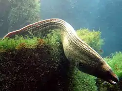 The mouth is wide, the jaws strong and armed with formidable, generally sharply pointed, teeth, which enable the Muraena not only to seize its prey (which chiefly consists of other fishes) but also to inflict serious, and sometimes dangerous, wounds on its enemies. It attacks persons who approach its places of concealment in shallow water, and is feared by fishermen.[3] At least one species, Muraena retifera, possesses an additional "raptorial pharyngeal jaw" within the pharynx, which is mobile and can be thrust forwards quickly to assist in grasping prey.[4]
