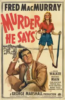 Murder, He Says is a 1945 American black comedy film directed by George Marshall and starring Fred MacMurray about a murderous rural family and the hapless pollster who becomes entangled in their hunt for a cache of money.
