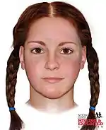 The woman had been between 5 ft 4 in (163 cm) and 5 ft 6 in (168 cm) in height, aged between eighteen and twenty-six, and weighed 125–130 pounds (57–59 kg).[21][22] She had naturally reddish-brown hair, which was parted in the middle and braided into pigtails on both sides of her head.[10][11][22][21] Her eyes were light brown in color, and she had freckles across her face.[10] In addition, her nose was described as being "very pointed".[23] The victim also had a ruddy complexion, indicating she had spent a lot of time outdoors in the final weeks or months of her life.[10][24]