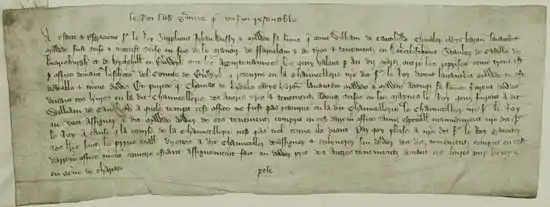 A later jury established that de Cantilupe was "at peace with God and the lord king", and Pedersen has taken this to indicate that he had prayed, and, therefore, was about to retire for the night.[10] In a premeditated and minutely planned attack,[16] de Cantilupe was stabbed to death with many blows. The precise date of the crime is unknown; the juries that heard the indictments offered dates varying from 13 February to 11 April 1375.[9] Pedersen has suggested the evening of Friday, 23 March[17] or the following Friday, as most probable.[8] Five of the seven quarter sessions juries which subsequently sat suggested the latter, the other two decided it was the former date.[18][note 11]