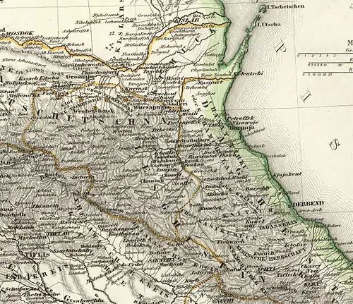 - The eastern boundary lay inland from the Caspian Sea where the foothills meet the Caspian plain.