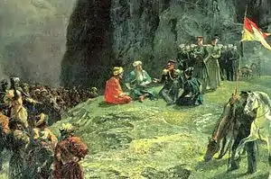 1835–36: A quiet period: For something over a year the mountaineers were left alone. Shamil seemed weak, Klugenau had only 2500 men and most Russian troops were tied up in Circassia. Klugenau thought the Dagestanis should not be attacked unless they could be decisively defeated. Around the end of 1834 he and Shamil made a very informal agreement in which Shamil accepted Russian suzerainty and agreed not to attack the lowlands in return for Russian non-intervention in the mountains. Shamil spent much of the year preaching and reading the Koran, thereby strengthening himself as a religious as well as a military leader. At some point Shamil moved from Gimry to Ashitla. Although Shamil had the title of Imam several other men were almost his equals. Hajj Tasho had a fort "on the Michik River near Zandaq" (?[12]) from which he actively raided the Russians. At the beginning of 1836 he sent an appeal to the Dagestani leaders complaining of Shamil's inactivity. Shamil called a meeting at Chirkey in which they agreed to work together under his leadership. By mid-1836 Shamil had enough power to begin organizing administration and taxation. The Russians began to worry. On 26 July Pullo captured Zandak with a ‘terrible massacre’ and Reoute entered Dagestan, but accomplished nothing. In October Shamil tried negotiations, but the Russians demanded near complete surrender.