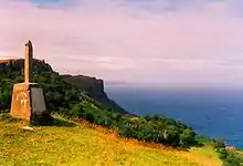 Although he is now buried in Dublin, Murlough Bay was the burial place of choice of Roger Casement, a former British Government Diplomat, knighted by King George V in 1911 and Irish Nationalist revolutionary leader who was executed by the Government of the United Kingdom for treason in August 1916 during World War I. While waiting execution in Pentonville prison he sent a letter to his cousin Gertrude Bannister in which he wrote "Take my body back with you and let it lie in the old churchyard in Murlough Bay." Roger Casement was a frequent visitor to Ballycastle, he stayed with relatives there and found a close affinity to the beauty and wildness of the location. The plinth is what remains of a more recent cross which was erected on the site to commemorate Sir Roger Casement.[2]