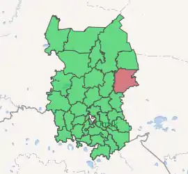 Muromtsevsky District (Russian: Му́ромцевский райо́н) is an administrative[1] and municipal[6] district (raion), one of the thirty-two in Omsk Oblast, Russia. It is located in the east of the oblast. The area of the district is 6,700 square kilometers (2,600 sq mi). Its administrative center is the urban locality (a work settlement) of Muromtsevo.[1] Population: 23,795 (2010 Census);[3] 28,380 (2002 Census);[8] 31,935 (1989 Census).[9] The population of Muromtsevo accounts for 45.3% of the district's total population.[3]