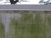 Chotiner is buried at National Memorial Park in Falls Church, Virginia.[93] The adage known as "Chotiner's Law" is named for the former Nixon adviser. It holds that if an incumbent is seriously challenged in a primary election, he will be unable to recover and will lose the general election. Chotiner's Law has held true in every presidential election since his death.[94]