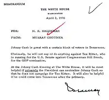 The day after Nixon's election as President in November 1968, he asked Chotiner what job he would like, and Chotiner indicated that he wanted to be chairman of the Republican National Committee (RNC), but was told that was impossible.[74] However, Mitchell and soon-to-be White House Chief of Staff H.R. Haldeman wished to see Chotiner given a position outside the White House, as they saw him as a rival. Accordingly, they proposed that Chotiner be made RNC executive director, to wield the real power with the chairman as figurehead. A reluctant Nixon, who was worried about Chotiner's hatchet-man reputation, finally agreed, and Chotiner wrapped up his affairs in California.[74]