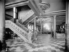 The interior featured a vestibule and a short flight of marble stairs that lead to the office floor. The great hall had a high ceiling. The floor was of marble. The sienna was set against slate in a carpet pattern. The office area had a large counter where arriving guests could register. The book stand had access to several periodicals and newspapers. The great fireplace contained huge burning logs.[4] The electric clock was lit at night, and the chandeliers illuminated halls and parlors, their supply of electricity generated from machines in the basement. The ice was made in huge condensers. Meals were ready at all hours. Restaurants above and below stairs were always open.[1]