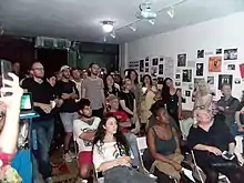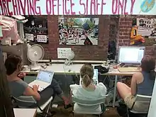 The museum, founded by neighborhood activists in 2012, documents this history. It is located in the storefront of C-Squat, one of the few still-occupied squats on the Lower East Side.[3] The museum is “decidedly local,” run by local volunteers, and presents the neighborhood's history through a combination of exhibitions, walking tours, and events.[4] Permanent exhibitions explore various themes aspects of the neighborhood's radical history, including sustainability, activist spaces, and the Occupy Wall Street movement. Rotating exhibitions have covered 1980s political street posters and stencils and the community garden movement; a current exhibition documents the punk movement and its politics. The educational walking tours lead participants through neighborhood squats and community gardens, describing complex histories and struggles with developers and police over the control of urban space in the East Village.[5] The tour guides are neighborhood activists and historians. The museum claims that these activities and exhibitions “seeks to connect the neighborhood’s history of activism with the principle of sustainability.”[1]: 263 In 2020, the museum self-published a book, History of the East Village & Museum of Reclaimed Urban Space, which catalogs the history of MoRUS and that of the East Village.[6]