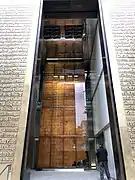 Each of the six floors in the museum contain a different exhibit which emphasizes different aspects of the Bible's history or impact. This includes three permanent exhibit floors, each measuring 55,000 square feet (5,100 m2).[19] The first floor combines ancient artifacts with modern technology meant to immerse the participant in the Bible. The front entrance on 4th Street SW features 40-foot (12 meter) tall, 2.5 tonnes (2,500 kg) bronze front doors with stained glass art containing a relief depicting the creation account in Genesis.[19][24] There is also a grand lobby with a 200-foot (60 meter) LED ceiling allowing for changing visual effects and messages.[19]