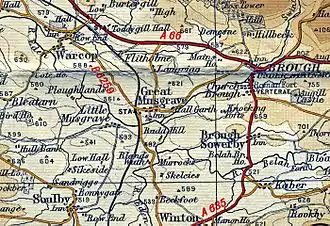 The railway line and station were built by the Eden Valley Railway (EVR). The line opened for mineral traffic on 8 April 1862 and for passengers on 9 June 1862.[1] The station served the villages of Great Musgrave and Little Musgrave and also nearby Brough. The EVR was worked from the outset by the Stockton and Darlington Railway (S&DR) which absorbed the EVR on 1 January 1863.[2] The S&DR was in turn absorbed by the North Eastern Railway (NER) on 13 July 1863.