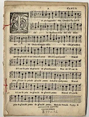 The first testimonies were related to the sacred performances of the Passion of Christ which were located in the Loggia del Giuramento, and were a central moment in the life of the citizens because the entire population was involved in the spectacular staging.[3] Beginning in the 1500s, the Chappell of the Cathedral became the main musical organization, next to the single parishes and churches of the Dominican order and of San Filippo, the latter attended by nobility. Starting in the 1600s, the Rospigliosi family was central to the music scene in Pistoia,[4] together with Melani and Pasquini. With their donations they succeeded in ensuring that the Chappell always continued to excel.[3] In this period, the dynasties of composers Gherardeschi and Brunetti, who dominated the music in Pistoia even in the 1700s, were affirmed. The entire activity of the Chappell and the works of its masters, made up of compositions from scratch such as the performance and collection of the works of other composers, has been merged, and is today available for consult, in the preserved documents of the Biliotheca Musicalis of the Archive of the Chapter[2][5] and at the Forteguerriana Library (Biblioteca Forteguerriana),[6] while the materials produced by the single parishes are today found in the State Archive (Archivio di Stato),[7] in the Leoniana Library at the Vescovile Seminary,[8] the Old Library of Canonici (today at the Archive of the Chapter),[9] and at the Dominican Library.[10]