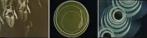 Composed in 1947 for a segment of Hans Richter's surrealist film Dreams That Money Can Buy. The film contains several segments designed by different artists, and Cage's music was composed for a segment designed by Marcel Duchamp.[15] The segment—a dream one of the characters is having—is titled "Discs" and consists mostly of Duchamp's rotoreliefs. These are designs painted on flat cardboard circles, which are to be spun on a phonographic turntable.[22][23] The work was later choreographed by Merce Cunningham. The global structure is 11x11 (eleven sections of eleven bars each), the rhythmic proportion is 2, 1, 1, 3, 1, 2, 1.[24] Similarly to Tossed As It Is Untroubled and The Unavailable Memory of, the work mostly builds on a single melodic line, which uses notes muted by weather strippings. This piece is one of the first to explore the idea of silence systematically: empty bars are juxtaposed with melodic passages throughout the piece.[15]