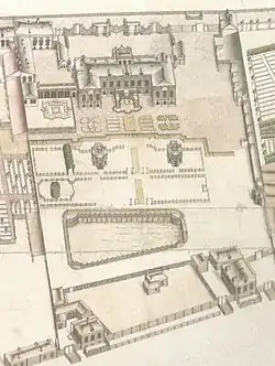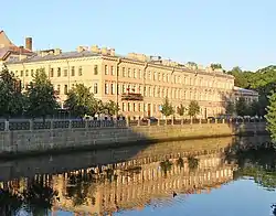 The next owner of the site with all the buildings and the garden was M. A. Kusovnikov, a merchant. In the 1804 city register the plot was placed in the fourth Admiralty division of the first block. The plot was numbered 46 and valued at 50,000 rubles. By the time of the 1822 register, the estate was owned by E. V. Kusovnikova, and was valued at 65,000 rubles.[7] The house appears in Friedrich von Schubert's 1828 plan of the city, its appearance having altered slightly after the construction of an annex near the Moyka and a building along the left border of the plot of land as seen from the Moyka river. This building extended nearly up to the end of the plot and abutted the buildings of the Lithuanian castle. Two buildings parallel to each other stretched along Ofitserskaya ulitza (Officers' Street), where building 31 is now located. By 1828 that part of the estate was owned by the provisioning department of the Ministry of War, which remained its owner until 1842. In 1834 in accordance with E.V. Kusovnikova's will her granddaughter Yelena Petrovna Varentzova became the owner of the estate.[8][9] That year street numeration was introduced, and the plot was designated as number 95 on the Moyka embankment.
