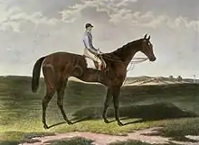 At Epsom, Musjid was ridden by John Wells and started 9/4 favourite in a field of thirty runners.[8] Many bookmakers faced paying out huge sums if Musjid won and attempts were made to ensure his defeat.[9] Several jockeys attempted to box in the favourite while others, including the rider of the joint-second-favourite The Promised Land, were alleged to have deliberately “pulled” their horses to ensure a win for the outsider Marionette. In a rough[10] and unsatisfactory race, Wells managed to extricate Musjid from a bad position and produced the colt with a strong late challenge to take the lead well inside the final furlong and win by half a length from Marionette and Trumpeter. Confusion ensued when the racecourse judge completely misread the finish and awarded second place to a colt named Ticket-of-Leave who had not finished in the first ten: the correct finishing order was only established after an inquiry.[11] Hawley's winning bets on the colt were reported to be the highest ever paid out to an individual on a single race.[9]