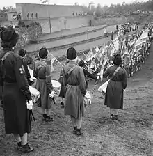 Between 1936 and 1940, the NSB organized annual Hagespraken at the location, open-air propaganda meetings based on a supposed Germanic ideal and modeled after similar meetings in Germany. The place was visited by tens of thousands of NSB members, though the atmosphere was more that of a boy scout jamboree.[2] One of the speakers at the (last) meeting on 22 June 1940 was Adriaan van Hees, who called for vengeance for the death of eight NSB members who had been executed during the German invasion of May 1940.[3] After 1940, mass gatherings of a political kind were forbidden by the German occupying forces; after the war, the wall fell into disrepair. As of 2015 the wall, overgrown in places, is little more than a boundary for a local campground; the masonry is crumbling and the associated buildings are ruined.[4]