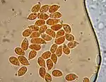 The spores are broadly ellipsoid, amyloid (meaning they will adsorb iodine when stained with Melzer's reagent), and measure 7–10 by 4–6 μm.[13] The basidia (the spore-bearing cells) are usually four-spored, although two- and three-spored forms have been found on which the spores measure 11–14 by 6–6.5 μm or 8–10 by 3.5–4.5 μm, respectively.[16] The pleurocystidia (cystidia on the face of a gill) are scattered, rare or absent, 30–44 by 9–13 μm, variable in shape, fusoid-ventricose to club-shaped, with some having a forked apex. The pleurocystidia that are club-shaped occasionally have two or three finger-like prolongations. The cheilocystidia (cystidia on the gill edge) are numerous, and similar in morphology to the pleurocystidia. The flesh of the gill is homogenous, composed of enlarged hyphae that stain vinaceous-brown in iodine. The flesh of the cap has a well-differentiated pellicle, the cells of which bear numerous rodlike prolongations. The hypoderm (a layer of tissue immediately below the pellicle) is well-formed, while the remaining tissue is floccose; all but the pellicle are vinaceous-brown in iodine stain.[13]