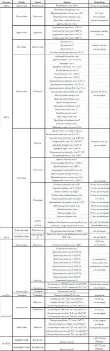 The majority of mycoviruses have double-stranded RNA (dsRNA) genomes and isometric particles, but approximately 30% have positive-sense, single-stranded RNA (+ssRNA) genomes.[1][2] However, negative single-stranded RNA viruses and single-stranded DNA viruses have also been described.[9][10][11] The updated 9th ICTV report on virus taxonomy[12] lists over 90 mycovirus species covering 10 viral families, of which 20% were not assigned to a genus or, in some cases, not even to a family.