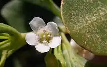 The flowers are arranged in groups of 1 to 8 on a stalk 5–15 millimetres (0.2–0.6 in) long in the axils of the leaves and have 5 sepals and 5 white petals joined at their base to form a tube. The tube is 2–4 millimetres (0.08–0.2 in) long and hairy in the upper part, the lobes are 2–3 millimetres (0.08–0.1 in) long and hairy on the inner part. There are 4 stamens which sometimes fill the upper part of the hypanthium. Flowering occurs in spring and summer and is followed by fruits which are drupes 5–10 millimetres (0.2–0.4 in) in diameter and shiny pink, sometimes cream blotched with purple.[1][2]