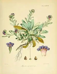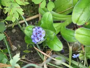 Myosotis capitata is a species of flowering plant in the family Boraginaceae, endemic to the Campbell and Auckland Islands of New Zealand.[3] Joseph Dalton Hooker described the species in his 19th century work Flora Antarctica.[4] Plants of this species of forget-me-not are perennial and erect, and have ebracteate inflorescences and blue corollas. It is one of two native species of Myosotis in the New Zealand subantarctic islands, the other being M. antarctica, which can also have blue corollas.