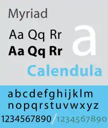Myriad is a humanist sans-serif typeface designed by Robert Slimbach and Carol Twombly for Adobe Systems, released in 1992. Myriad was intended as a neutral, general-purpose typeface that could fulfill a range of uses and have a form easily expandable by computer-aided design to a large range of weights and widths.[1][2]