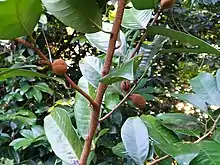 Myristica insipida is a small, single-stemmed tree usually growing up to 16 m (52 ft) in height but it may reach 25 m (82 ft) in certain conditions.[4] The trunk is cylindrical and straight, in mature trees it may exceed 30 cm (12 in) DBH. The bark is dark brown with numerous fine vertical fissures. As with other members of the family, this species displays the distinctive habit known as "myristicaceous branching", in which up to five primary branches are produced in a whorl from the trunk at regular intervals (see Gallery).[5][6] The branches extend horizontally from the trunk and the twigs carrying the leaves are also held in a horizontal plane, creating a layered appearance.[7][8]