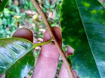The exstipulate leaves are simple and alternate, dark green and glabrous (hairless) on the upper surface, much paler and glabrescent (almost glabrous) underneath, with 6 to 14 pairs of lateral or secondary veins. They are elliptic to ovate in shape, often with an acuminate tip (commonly called a "drip tip"). They are variable in size, from 2–7 cm (0.8–2.8 in) wide by 10–25 cm (3.9–9.8 in) long. The petiole, or leaf-stalk, measures between 5–15 mm (0.2–0.6 in) long and is channelled on the upper side. The lateral veins are evident on both sides of the leaf, while the reticulate (net-like) tertiary venation is only visible on the lower surface. The buds and new shoots are typically covered in very fine, dense brown hairs.[4][7]