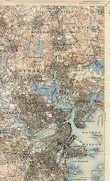 ![]() Boston Harbor basin, showing the Mystic River drainage | |