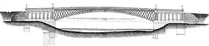 Like Telford's Craigellachie Bridge, Mythe Bridge was cast by William Hazledine, and is similar in form to Telford's Galton Bridge, which spans the Birmingham Canal at Smethwick. It has six cast iron ribs, each cast in 23-foot (7m) lengths, with spandrels filled with X-shaped bracing. Telford described the iron as "best Shropshire iron, commonly called No. 2"'. The arch rises 17 feet (5.2m), one tenth of the span.[3] The X-bracing carries the diagonal crossed bracing to the spandrels beneath the beam, as well as to the carriageway and balustrade. The abutments at either end of the bridge houses a group of six tunnel vaults with pointed arches and stone quoins. These are separated by the attached colonnettes.[4] Hugh McIntosh was contractor for the embankment and abutments.[5]