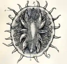 The Myzostomida or Myzostomatida are an order of small marine worms, which are parasitic on echinoderms, mostly crinoids. These highly unusual and diverse annelids[1] were first discovered by Friedrich Sigismund Leuckart in 1827.