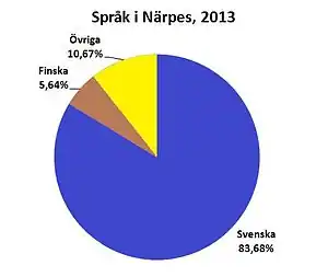 Närpes has been a bilingual municipality since 2016. Before that, Närpes was the last unilingually Swedish-speaking municipality in continental Finland.[6] Most locals speak a divergent variety of Ostrobothnian Swedish. The many bands who sing in that dialect include 1G3B and Nektor.