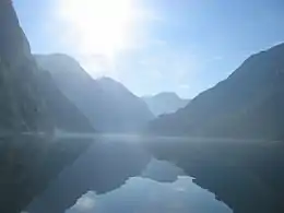 The Nærøyfjord (or Nærøyfjorden, Urban East Norwegian: [ˈnæ̂ːrœʏˌfjuːɳ]) is a fjord in Aurland Municipality in Vestland county, Norway. The narrow fjord is a branch of the large Sognefjord, and it is featured on the "Norway in a Nutshell" daytrips for tourists. The 18-kilometre (11 mi) long fjord is only 500 metres (1,600 ft) wide in some parts.[1]