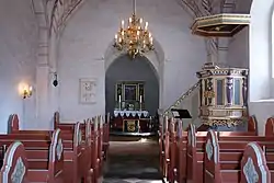 Nødebo Church is famous for its church frescos, the oldest of which, found on the triumphal wall, date back to late-Romanesque times. The vaults of the two bays of the nave and the choir are covered in paintings from 1425 while the tower bay is decorated with paintings by the so-called Union Master.[1]