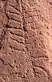The gorge was used by the Eastern Arrernte people, who called the area Ilwentje. It contains men's sacred sites, petroglyphs, shelter or occupation sites and art sites. The 6,000 stone carvings are believed to have been created in two separate periods, the first approximately ten thousand years ago, and the second approximately three thousand years ago.[4] They could be created by using two different techniques: either by pounding a rocky surface with another rock, or by a fine pecking technique.