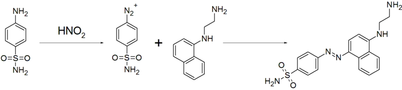 N-(1-Naphthyl)ethylenediamine dihydrochloride is widely used in the quantitative analysis of nitrate and nitrite in water samples by colorimetry. It readily undergoes a diazonium coupling reaction in the presence of nitrite to give a strongly colored azo compound. Sample containing nitrite ions is first neutralized and then treated with dilute hydrochloric acid at 0 - 5 °C to give nitrous acid. Then an excess but fixed volume of sulfanilamide and N-(1-naphthyl)ethylenediamine dihydrochloride solution is added. With nitrous acid as the limiting reagent, the azo coupling reaction produces an azo dye quantitatively with respect to the nitrite ions: