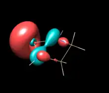 Computational studies and photoelectron spectroscopy create a more nuanced picture of electronic structure and π-electron sharing in NHSis. Relevant π bonding orbitals in unsaturated five-membered NHSis can be understood as the molecular orbital mixing of the diimine backbone's butadiene-like pi orbitals and the 3s and 3p orbitals of Si. Photoelectron Spectra of the unsaturated [tBuN−CH=CH−tBuN]Si: show a HOMO with three peaks at -6.96eV, -7.13eV & -7.28eV, assigned the in-phase overlap of the Si 3py orbital and butadiene-like π3 of the diimine. The HOMO in the tetravalent Si-hydrogenated analog lacks a vacant Si 3py orbital and the energy of the π3 is destabilized to -6.56 eV, supporting charge donation from N to Si in the silylene. The HOMO-1 is the in-plane Si lone pair involved in σ donation. No difference is calculated between the HOMO-2 for the unsaturated silylene compared to the corresponding orbital of the silane analog. The original 1994 Denk at al. photoelectron spectroscopy communication relates this orbital to the π2 diimine orbital, however a 1996 paper from Blakeman et al. designates this as the nitrogen lone pairs. Either way, both orbital assignments are symmetrically forbidden from overlapping with any Si orbital. The HOMO-2 does not change in energy upon hydrogenation at Si indicating that much of the overall electronics are unchanged by hydrogenation and underscoring the effects of N to Si electron π-donation in the HOMO and HOMO-3. Calculations in the former study at the MP4 6-31G* level showed increased energy level spacing for N-H model compounds (instead of N-tBu), but with the same order and proportional spacing.[5][9] The Blakeman study compared the benzo-fused NHSi to the ethylene-like unsaturated NHSi, and found by PES that the HOMO is lower by .36eV and the Si lone pair by .34 eV in the benzo-fused NHSi, suggesting the electron withdrawing power of the phenylene ring makes the benzo-fused NHSi less nucleophilic.[9]