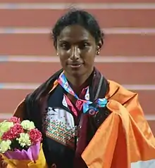 ![]() N.V. Sheena with her bronze medal in 2017 Women Triple Jump | ||||||||||||||