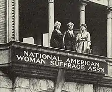 Helen Hamilton Gardener, Carrie Chapman Catt and Maud Wood Park (from left to right) on the balcony of Suffrage House, the Washington headquarters of the National American Woman Suffrage Association