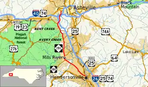 NC 191 begins at an intersection with US 25 Business / Asheville Highway in the city of Hendersonville in Henderson County. Named Haywood Road, it travels northwest from Hendersonville and enters the town of Mills River, where it meets NC 280 (Boylston Highway). NC 191 runs concurrent with NC 280 northward for a short distance before separating after approximately 1 mile (1.6 km).[1] The route continues north towards Asheville, leaving Henderson County and entering Buncombe County, before meeting the western terminus of NC 146 (Long Shoals Road) in the community of Avery Creek. Past Avery Creek, NC 191 intersects the scenic Blue Ridge Parkway, a National Parkway and All-American Road. The highway continues north into Venable, intersecting the eastern terminus of NC 112 (Sardis Road) and then I-26 and US 74 at exit 33 as it reaches the outermost city limits of Asheville. Entering the city, NC 191 interchanges with I-40 (exit 47) and one-half mile (0.80 km) later, with I-26/I-240 (exit 1B). NC 191 heads into the southwestern section of Asheville named Brevard Road. At just over 21.5 miles (34.6 km), the route reaches its northern end at US 19 Business/US 23 Business (Haywood Road).[1][2]