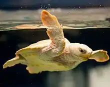 On August 11, 2010, a rare white sea turtle was brought to the aquarium for care. Nimbus, as the turtle was named, was weak and smaller than the average loggerhead hatchling. It turned up when a hatched-out Pine Knoll Shores nest was excavated for baby turtles left behind. Hampered by a cleft palate, it had to be coaxed into eating. It lagged behind in growth, also, but appears to be catching up with other hatchlings of the same age. Nimbus is on exhibit in the Tidal Waters Gallery. The turtle is something of a rock star at the aquarium — especially with visiting school groups.