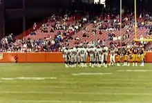 The first NFL team to name itself after the city of Los Angeles was the Los Angeles Buccaneers in 1926. However, this was a road team, based in Chicago, made up of Californians, primarily University of California and University of Southern California alumni. Historian Michael McCambridge said that the Buccaneers became a road team because the Los Angeles Coliseum Commission had banned pro teams from its stadium.[1] However, the difficulty of transcontinental travel in the era before modern air travel must have also been a factor in the decision to base the team in the Midwest.[2] The upstart American Football League also featured a similar Midwest-based road team of West Coast players, the Los Angeles Wildcats. Both Los Angeles teams performed respectably on the field but folded after the 1926 season amid league-wide overextension. Ironically, the Wildcats' last game was an exhibition in San Francisco against the Buccaneers in January 1927.[3]