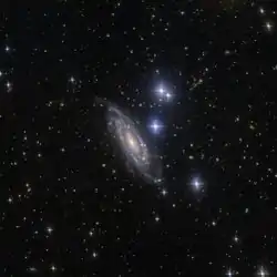NGC 1964 is a barred spiral galaxy in the constellation Lepus. The galaxy lies 65 million light years away from Earth, which means, given its apparent dimensions, that NGC 1964 is approximately 100,000 light years across. At its center lies a supermassive black hole, with estimated mass 2.5 × 107 M☉.[3] The galaxy features two tightly wound inner spiral arms within a disk with high surface brightness and two outer, more open spiral arms that originate near the inner ring. The outer arms feature few small HII regions.[4]