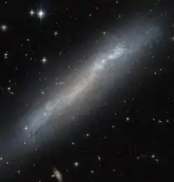 NGC 2188 is a spiral galaxy seen edge-on from the viewpoint of Earth as the centre and spiral arms of the galaxy are tilted away from us, with only the very narrow outer edge of the galaxy's disc visible to us. The true shape of the galaxy was identified by studying the distribution of the stars in the inner central bulge and outer disc and by observing the stars' colours.[4] The galaxy is close enough that its stars can be resolved. The brightest of them have an apparent magnitude of about 21.[5]