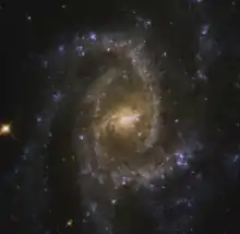 NGC 2835 is an intermediate spiral galaxy located in the constellation Hydra. It is located at a distance of circa 35 million light years from Earth, which, given its apparent dimensions, means that NGC 2835 is about 65,000 light years across. It was discovered by Wilhelm Tempel on April 13, 1884.[3] NGC 2835 is located only 18.5 degrees from the galactic plane.[4]