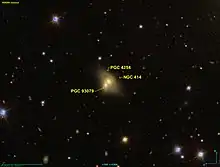 NGC 414 is a pair of lenticular galaxies (PGC 4254 and PGC 93079) of types S0 and E/S0, respectively, located in the constellation Pisces. It was discovered on October 22, 1867 by Herman Schultz. It was described by Dreyer as "very faint, small, irregularly round, much brighter middle, II 220 to the northwest.", with II 220 being NGC 410.[2]