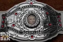 ![]() The center plate of the NWA World Women's Championship, introduced September 30, 2019. Pictured in the center is former champion Allysin Kay; the photo gets updated with every champion. | |||||||||||||||