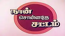 Naan Sonnathey Sattam (transl. My word is the law) is a 1988 Indian Tamil-language action film, starring Charan Raj and Rekha. The film, produced by Sri Manthralaya Chitralaya,[1] was released on 29 July 1988.[2]