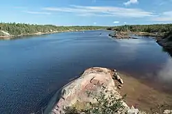 The Nabisipi River rises in Lake Saumur. It flows for 158 kilometres (98 mi) to the Gulf of Saint Lawrence west of Aguanish.[1] The river drains an area of 2,086 square kilometres (805 sq mi).[2] It lies between the basins of the Pashashibou River to the west and the Aguanish River to the east.[3] It crosses the Canadian Shield, and has many rapids.[4] At first it flows through the unorganized territory of Lac-Jérôme.[5] The mouth of the river is in the municipality of Aguanish in the Minganie Regional County Municipality.[6] The name in the Innu language means "man's river".[4]