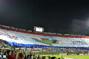In June 2013, Nacional supporters displayed for the first time the biggest flag in the world as they called the emblem during a match vs. Deportivo Toluca played for the 2013 Copa Libertadores. The flag cost US$50,000, previously collected amongst the supporters La Banda Del Parque[28] The flag, 600 meters in length and 50 meters in height,[29] entered the Guinness World Records as "the biggest flag ever seen in a football match".[30]