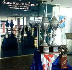 At international level, Nacional has won 22 titles recognised by FIFA and CONMEBOL,[4] including three Copa Libertadores. In this tournament, Nacional is the all-time leader with 553 points.[5] Nacional has also won all three Copa Intercontinental it has competed in, becoming the second three time world champion in 1988. In addition, Nacional is the only Uruguayan team to have won the Copa Interamericana (two times)[6] and the Recopa Sudamericana. In the latter competition Nacional won the inaugural edition in 1989.[7] Besides, Nacional won four Copa de Honor Cousenier,[8] three Copa Aldao[9] two Tie Cup,[10] and one Copa Escobar-Gerona,[11] all of them organized jointly by the Argentine and Uruguayan Associations.